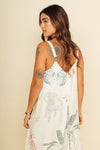 Enterizo largo elaborado en SEDA MANGO compuesta de 95% polyester y 5% elastano de 130 gramos con estampación en técnica de sublimación. La silueta es muy amplia con corte en triángulo (más ancho del busto hacía abajo) con cargaderas ajustables con tensor en los hombros y cuenta con forro/falso a la altura del pecho. Este textil no tiene elongación, es decir, no estira ni sede. También tiene textura liviana, ligera y cuenta con muy buena caída.