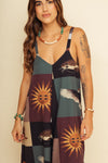 Enterizo largo elaborado en SEDA MANGO compuesta de 95% polyester y 5% elastano de 130 gramos con estampación en técnica de sublimación. La silueta es muy amplia con corte en triángulo (más ancho del busto hacía abajo) con cargaderas ajustables con tensor en los hombros y cuenta con forro/falso a la altura del pecho. Este textil no tiene elongación, es decir, no estira ni sede. También tiene textura liviana, ligera y cuenta con muy buena caída.