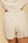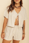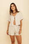 Conjunto compuesto por un short corto con toda la pretina enresortada y blusón con mangas anudable sobre el pecho elaborados en Tejido Plano Tejido Plano compuesto de 59% Viscosa, 23% Algodón, 17% Lino y 1% Spandex con textura suave al tacto. La caída es ligera y la tela no tiene elongación (es decir qué no estira). La silueta de estas prendas es semi amplia.