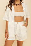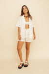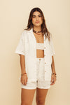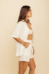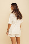 Conjunto compuesto de camisa oversize y short elaborados Tejido Plano compuesto de 30% Lino y 70% Viscosa con textura suave al tacto. La caída es ligera y la tela no tiene elongación (es decir qué no estira). Este textil no tiene elongación, es decir, no estira ni sede. También tiene textura liviana, ligera y cuenta con muy buena caída.