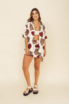 Camisa tipo oversize elaborada en Seda compuesta de 95% polyester y 5% elastano de 130 gramos con estampación en técnica de sublimación. La silueta es muy amplia tipo oversize unisex, tiene botonadura en resina de coco en toda la perilla y mangas anchas. Este textil no tiene elongación, es decir qué no estira, tiene textura liviana, ligera y con muy buena caída.