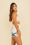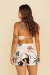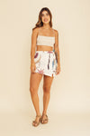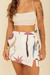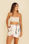 Faldashort corta elaborada en SEDA MANGO compuesta de 95% polyester y 5% elastano de 130 gramos con estampación en técnica de sublimación. La silueta es semi ajustada pues es entallada en la parte de la cintura, tiene botón en resina de coco y cierre y capa sobre puesta para anudar en un costado. Este textil no tiene elongación, es decir, no estira ni sede. También tiene textura liviana, ligera y cuenta con muy buena caída.